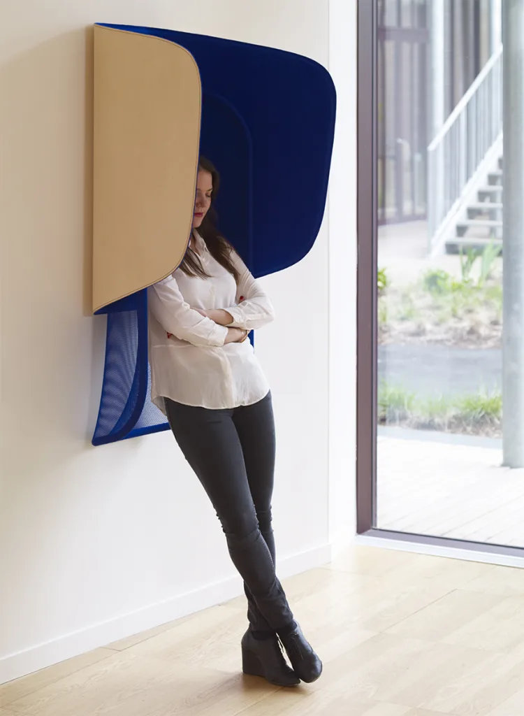 The integrated hood enhances acoustic comfort through softly curved upholstered panels, while its verticality introduces a new typology of comfort — ideal for short breaks in bustling spaces.