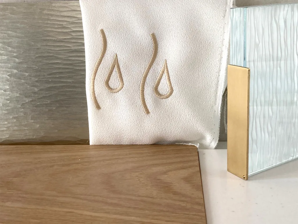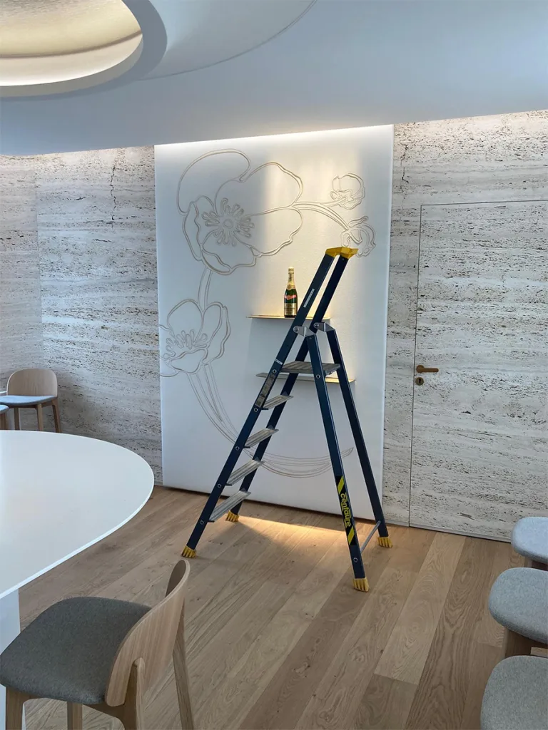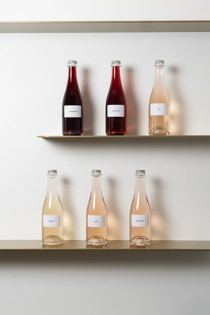 Travertine evokes the chalky vineyard soils, glass highlights the transparency of the wine, and touches of gold recall its luminous reflections. Particular attention was paid to the lighting, designed to faithfully reveal the colour of the wines while creating an atmosphere perfectly suited to tasting.