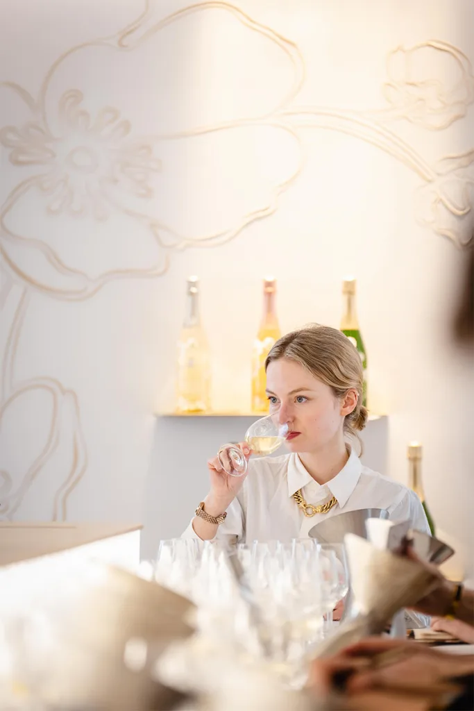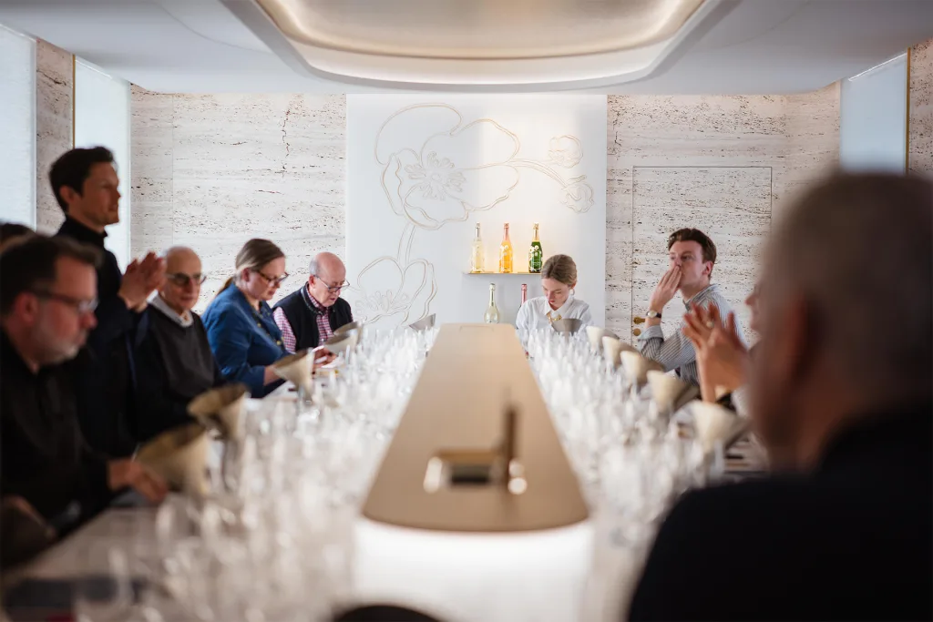 Conceived as a true experience, the tasting room extends the language of the wine through its architecture. Located in Épernay, within the historic buildings of Maison Perrier-Jouët, it provides an intimate setting dedicated to expertise and exchange. The Cellar Master welcomes wine experts to present the composition of the Champagnes, the blending process, and the philosophy behind each cuvée.